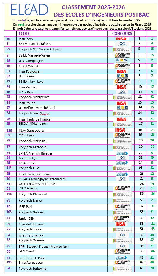 La lecture des classements des écoles d’ingénieurs postbac n’est pas toujours facile. Les concepteurs de ces palmarès à savoir Le Figaro, L’étudiant et L’Usine Nouvelle ne sont pas toujours en accord quant au ranking qu’elles établissent. Ces différences tiennent tout d’abord au fait que nous utilisons ici pour L’Usine Nouvelle son classement général de l’ensemble des écoles d’ingénieurs, postbac et postprépa confondus, tandis que pour Le Figaro et L’Etudiant nous utilisons les classements spécifiques que ces organes de presse proposent pour les écoles d’ingénieurs postbac.